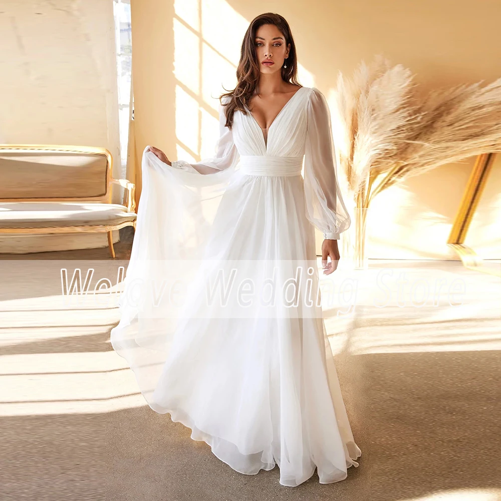 Chiffon Wedding Dress Long Sleeve Floor Length V Neck Open Back