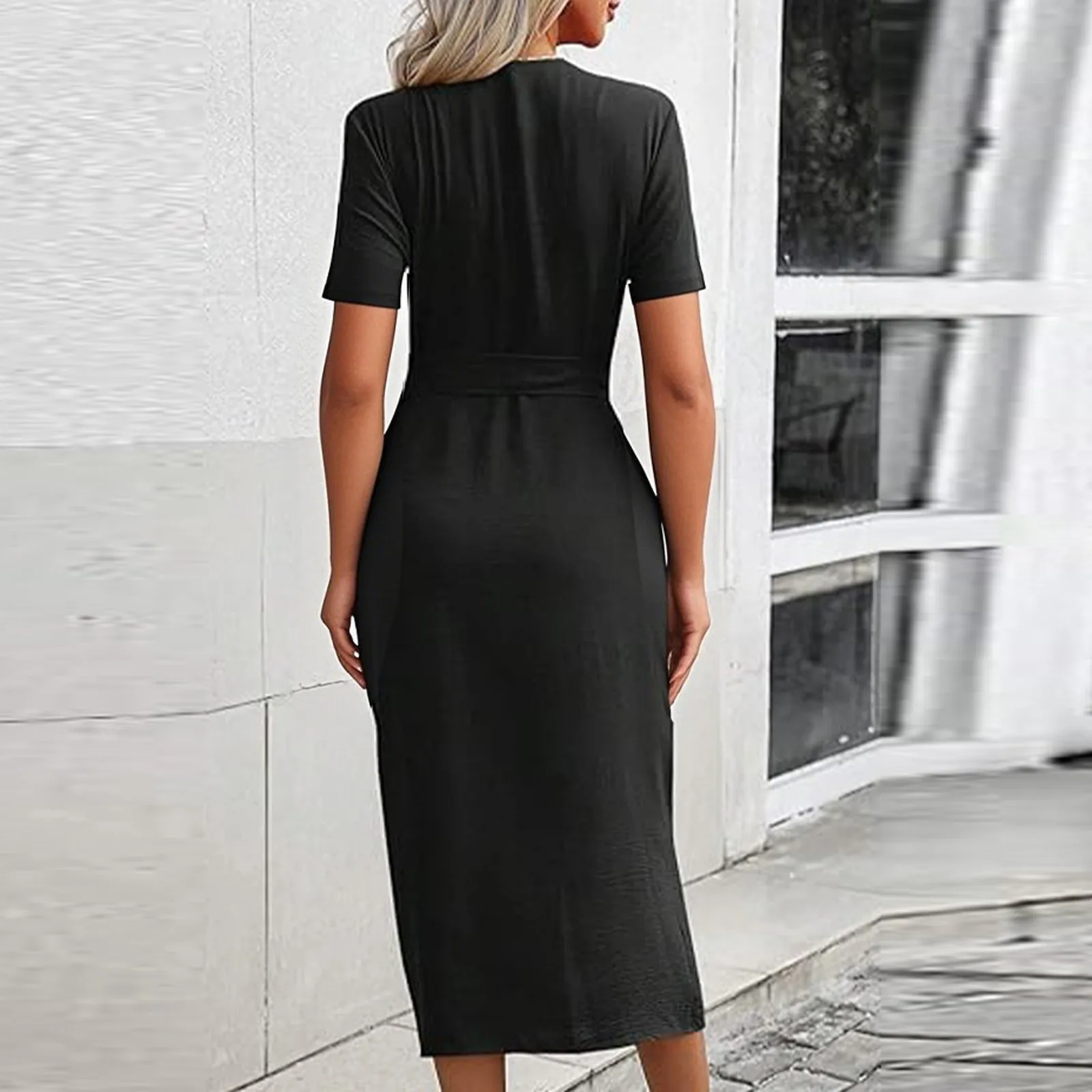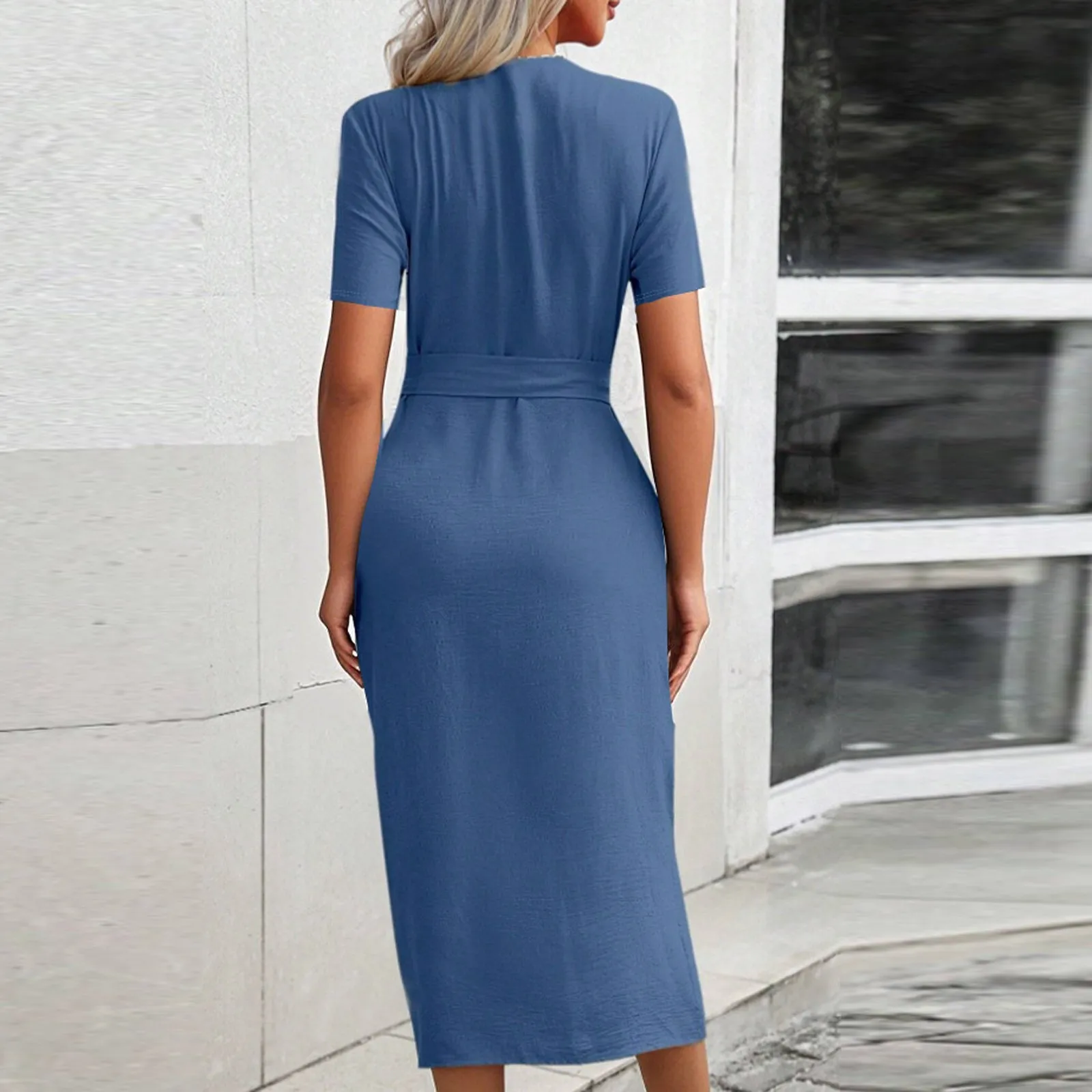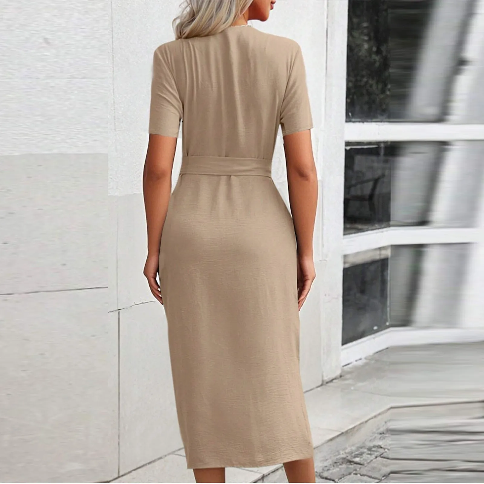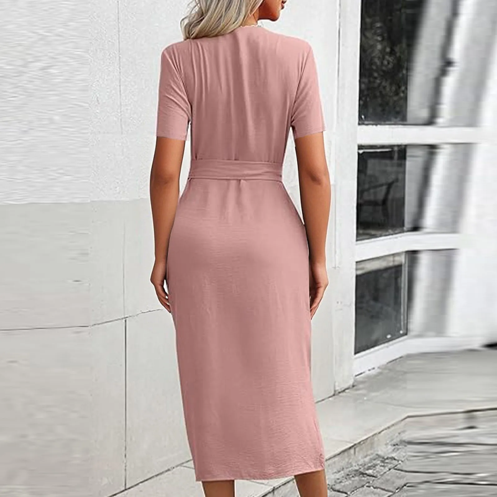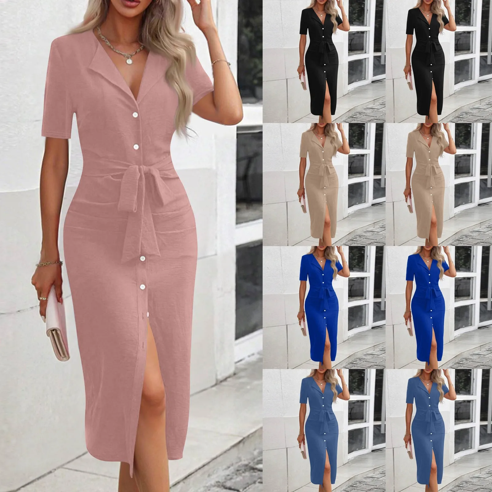 Women's Shirts Style Midi Dress V-neck Solid Color With Belt