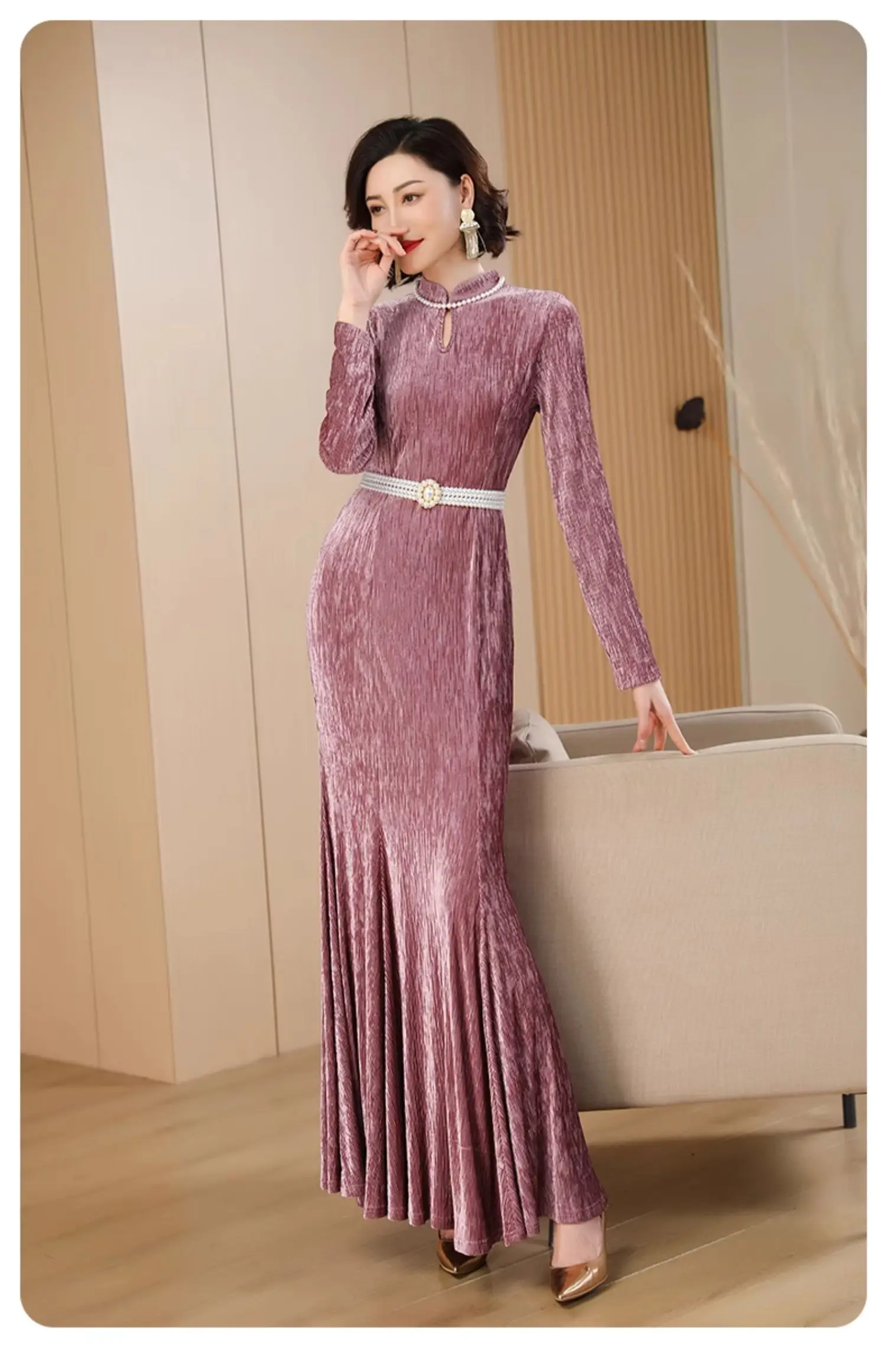 Pink Velvet Long Dress Women Mermaid Dress Evening Clothing