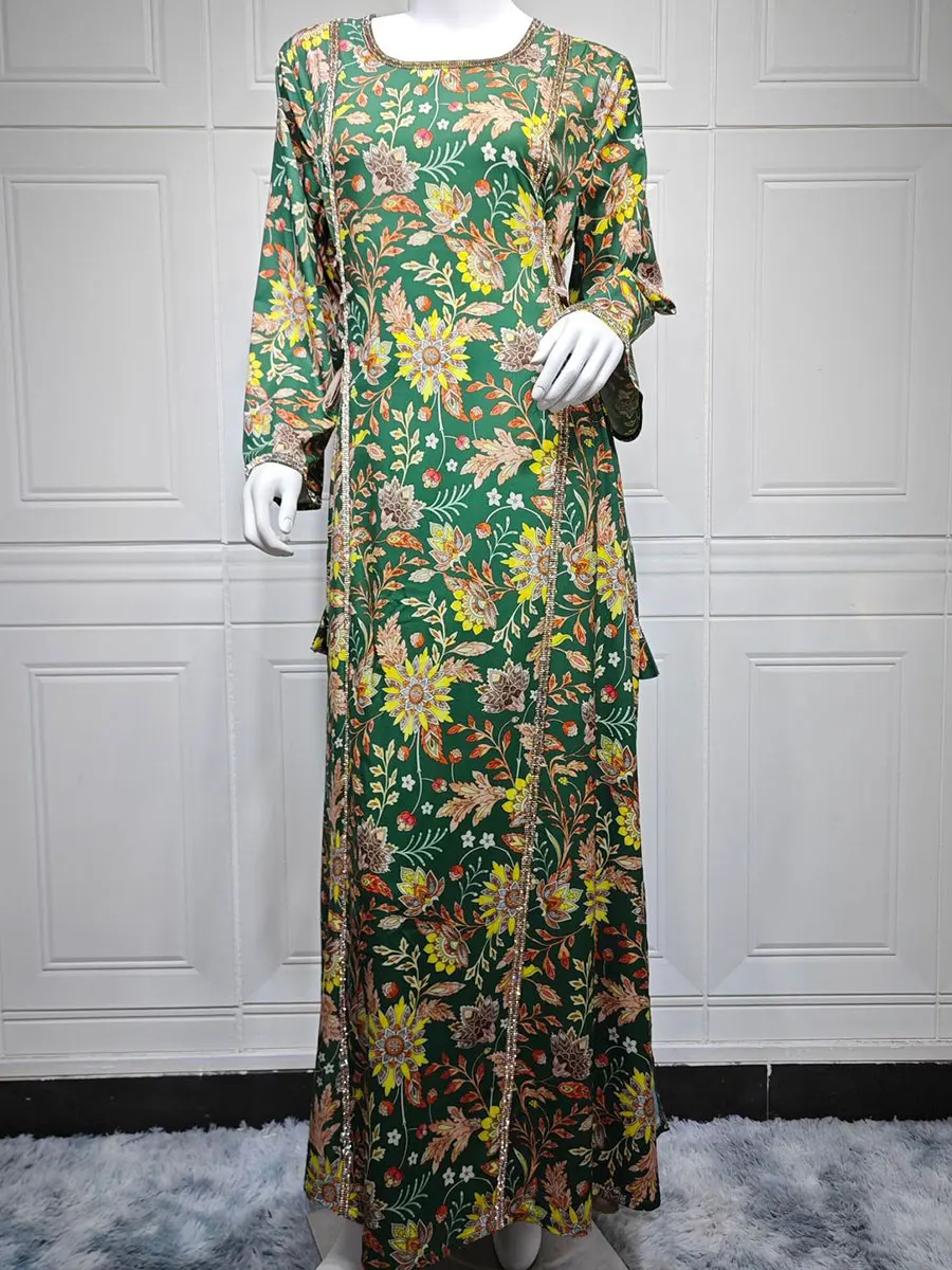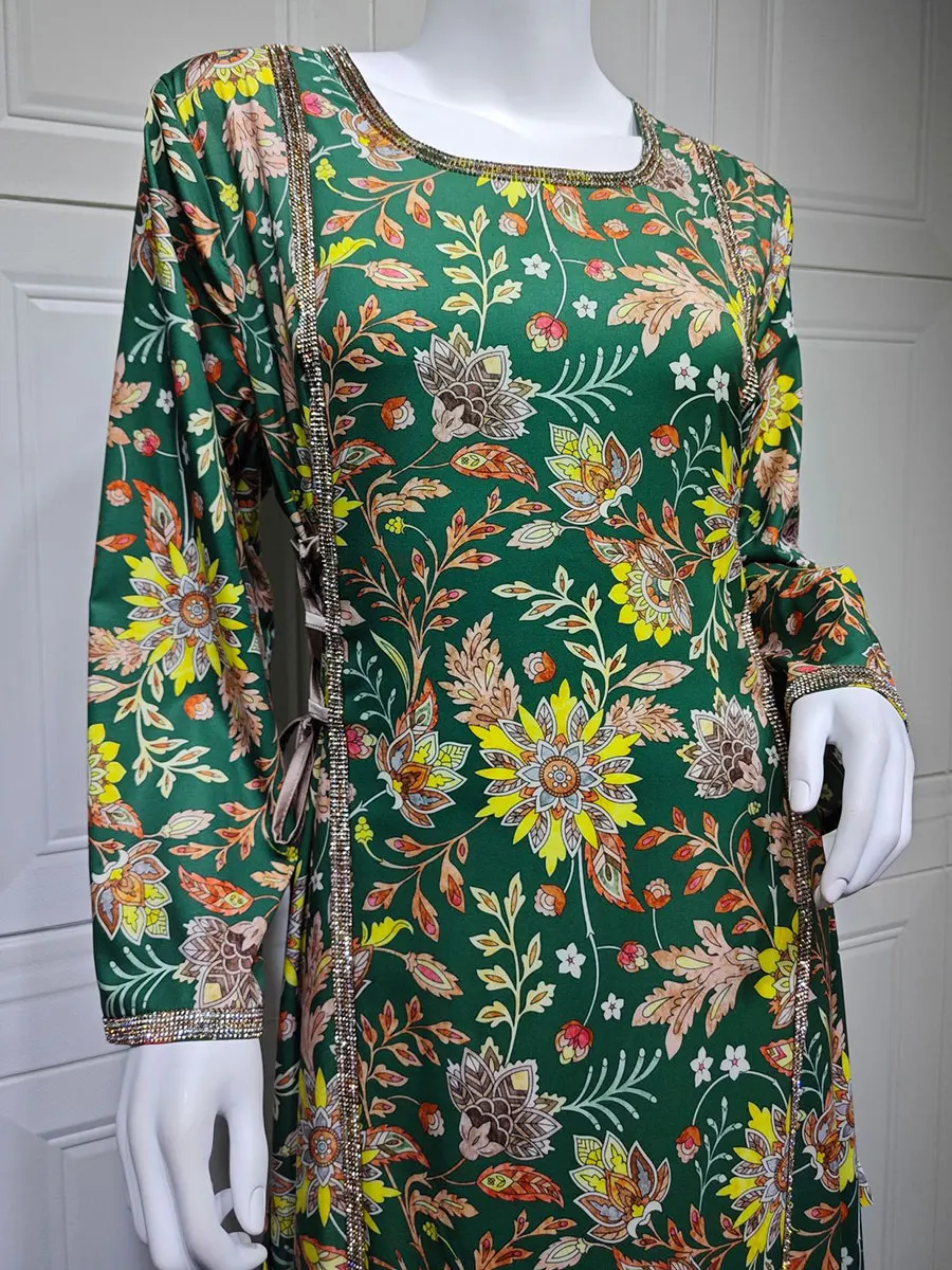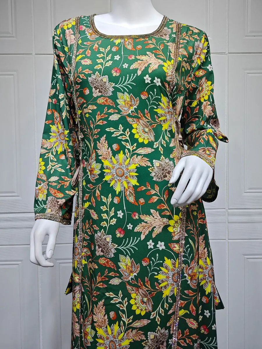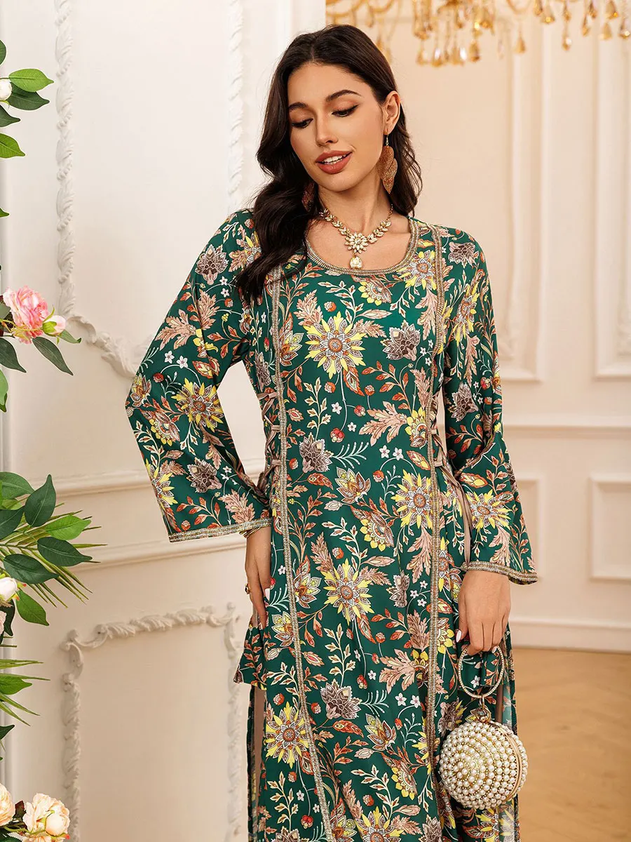 Stylish Floral Print Abaya Tunic Split Hem For Women's Evening