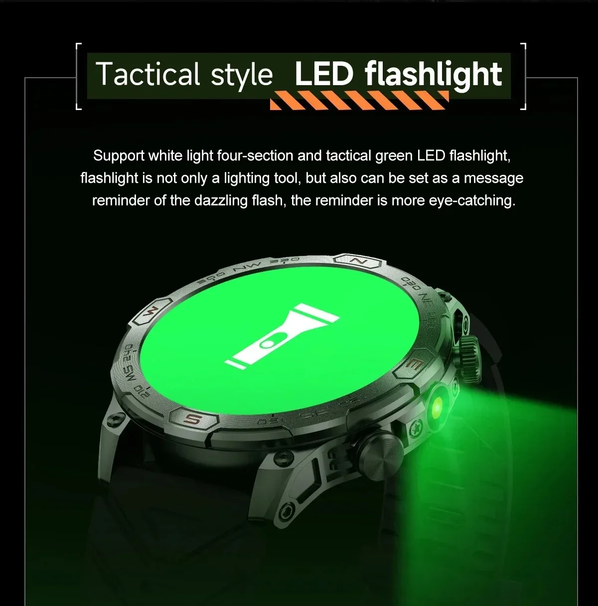 LED flashlight, compass, altimeter, barometer.