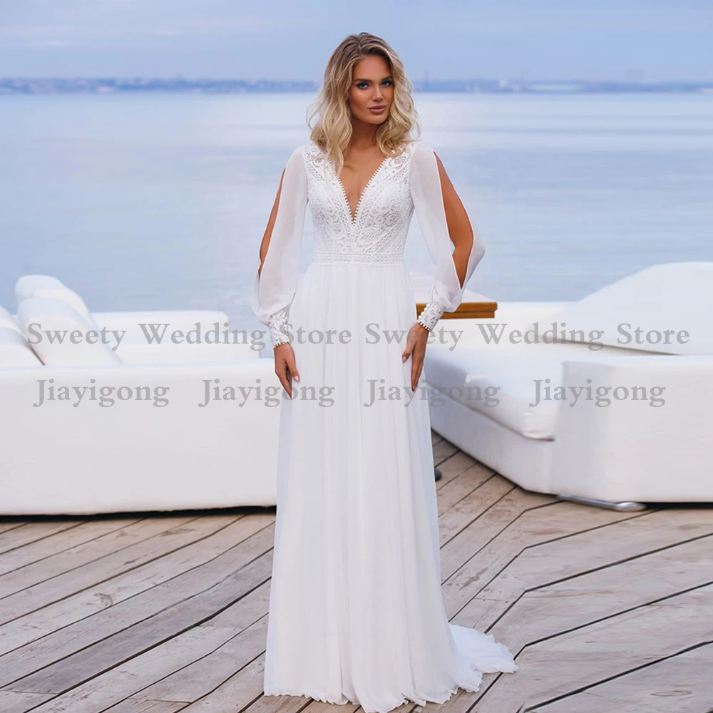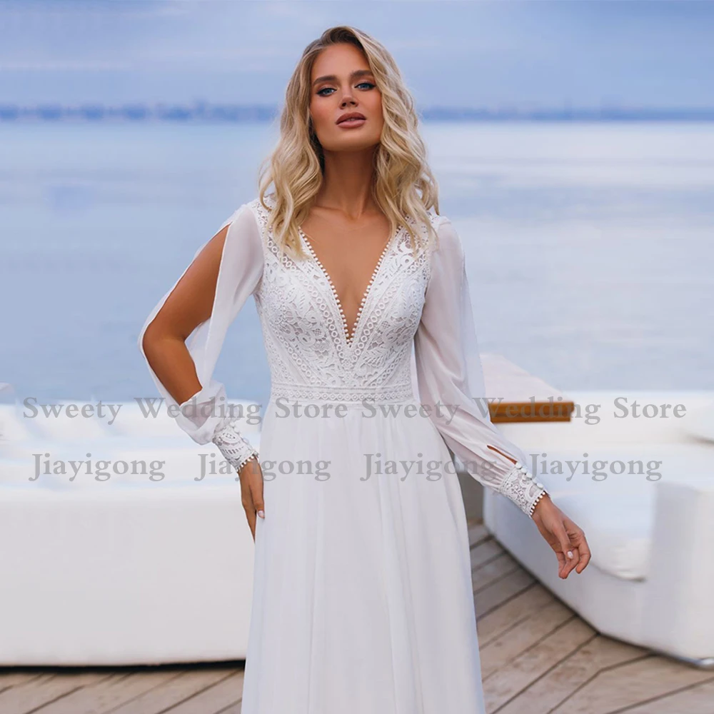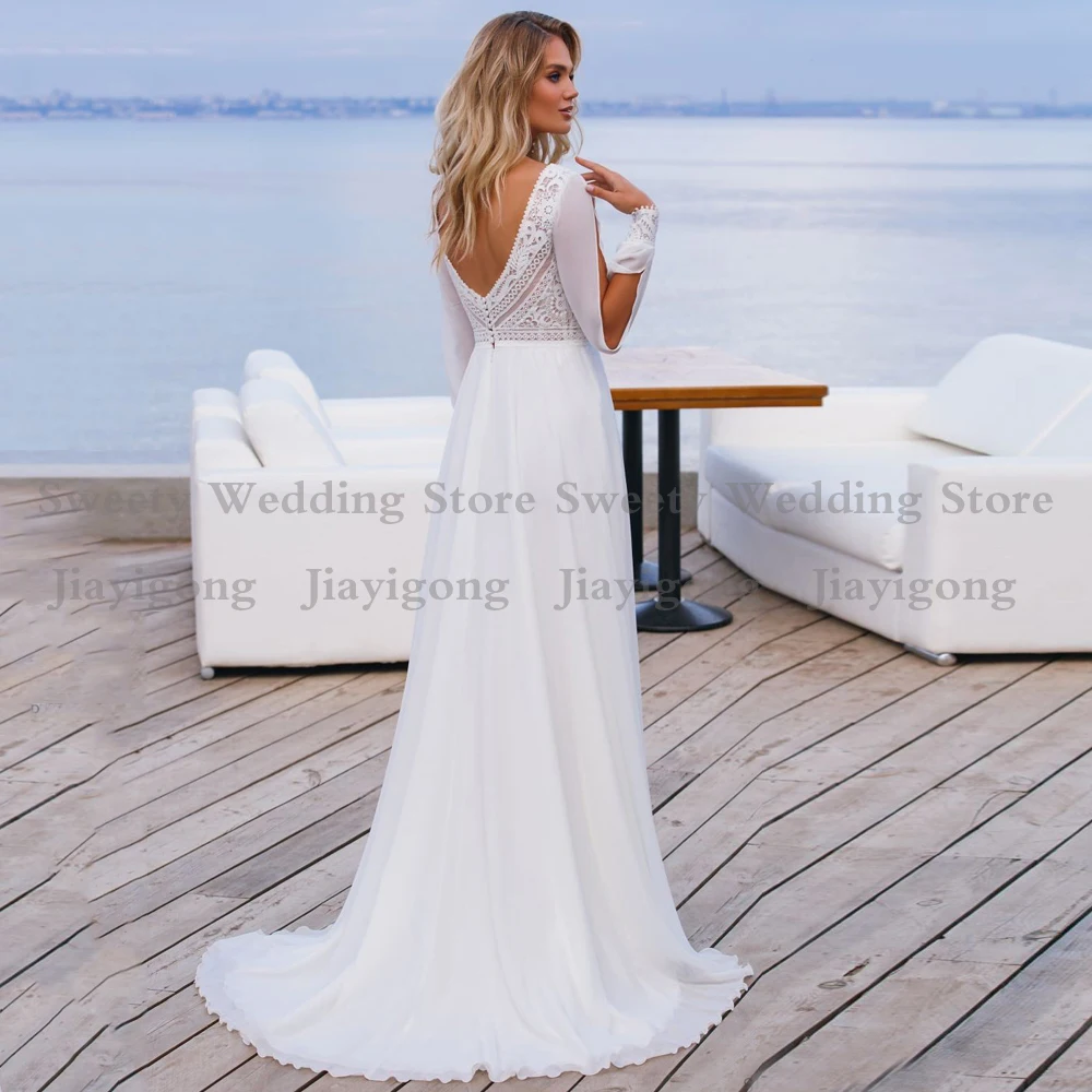 Wedding Dress Long Sleeves Cut V Neck Lace Chiffon Open Back