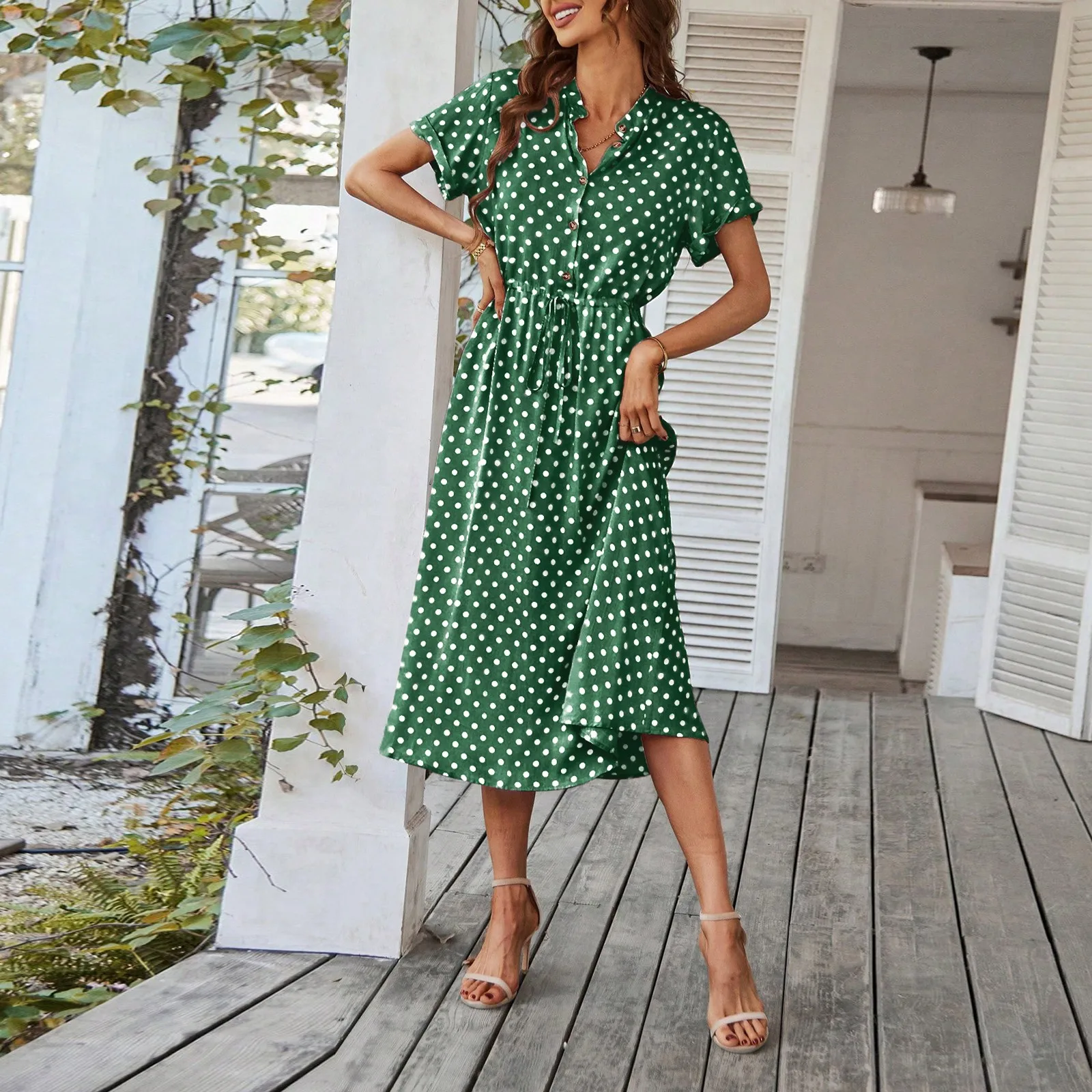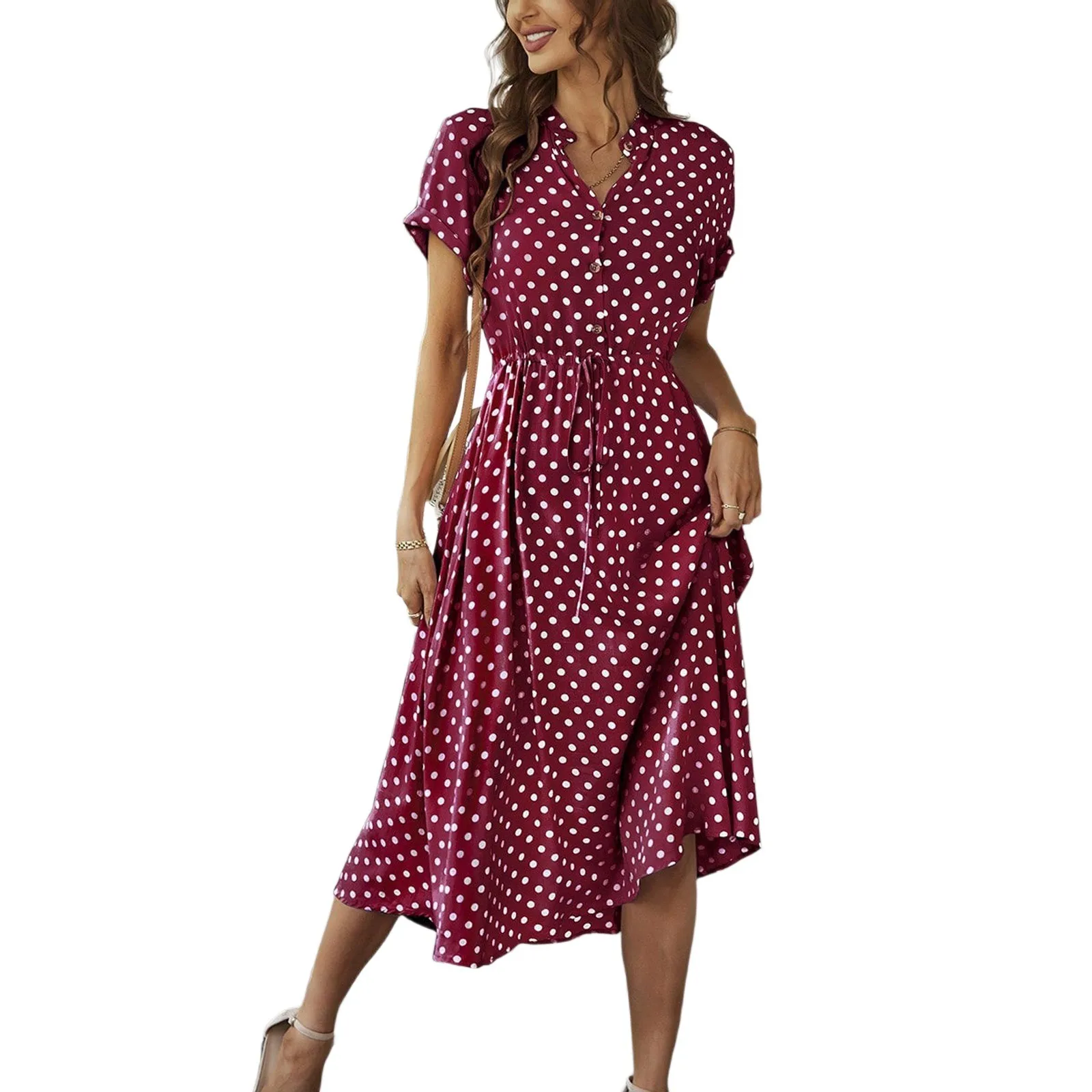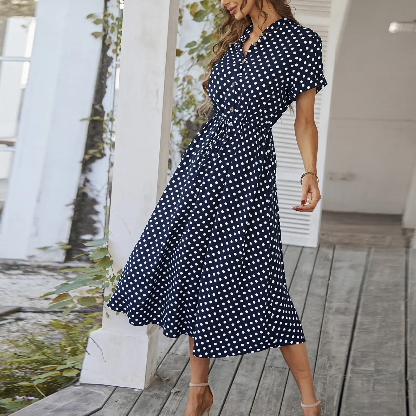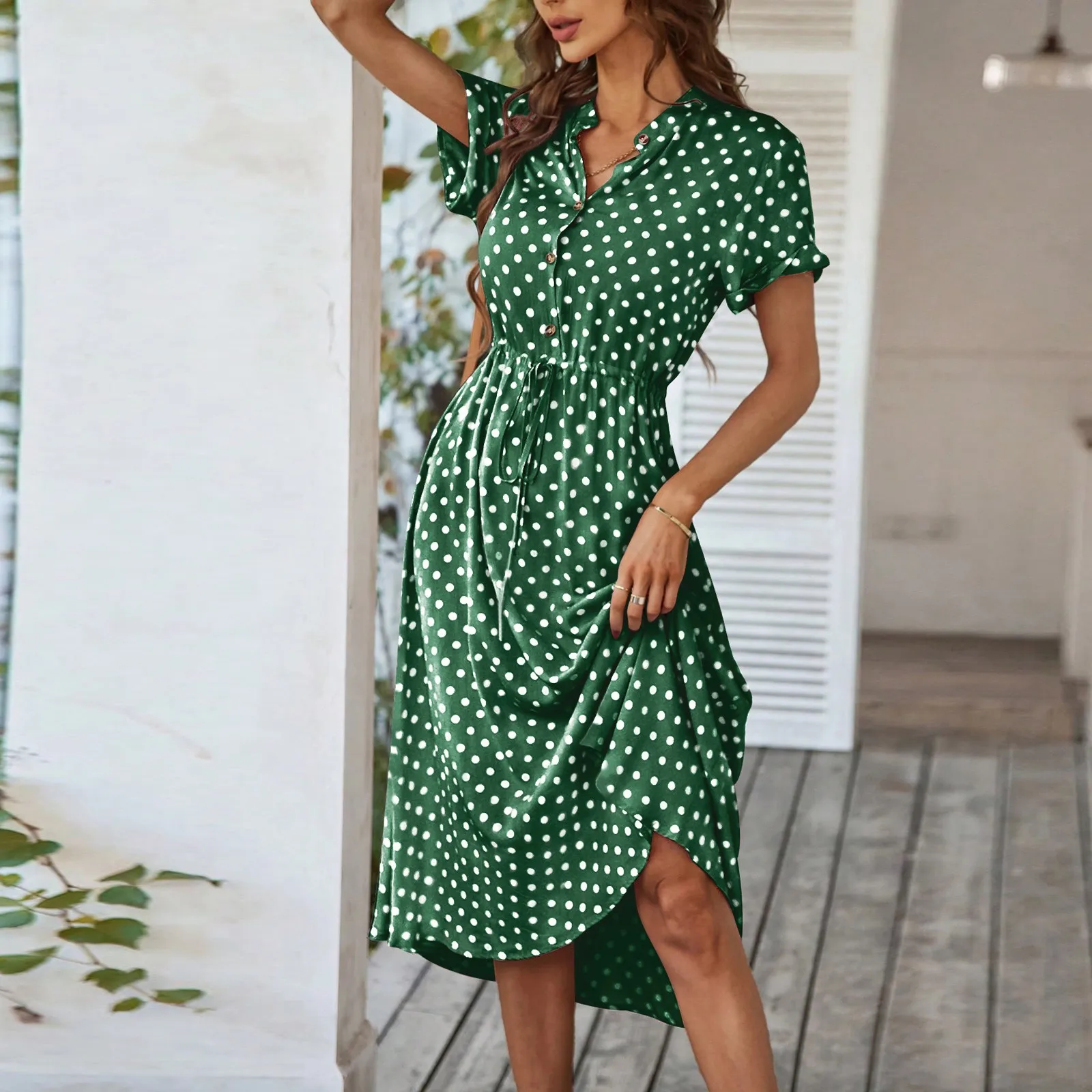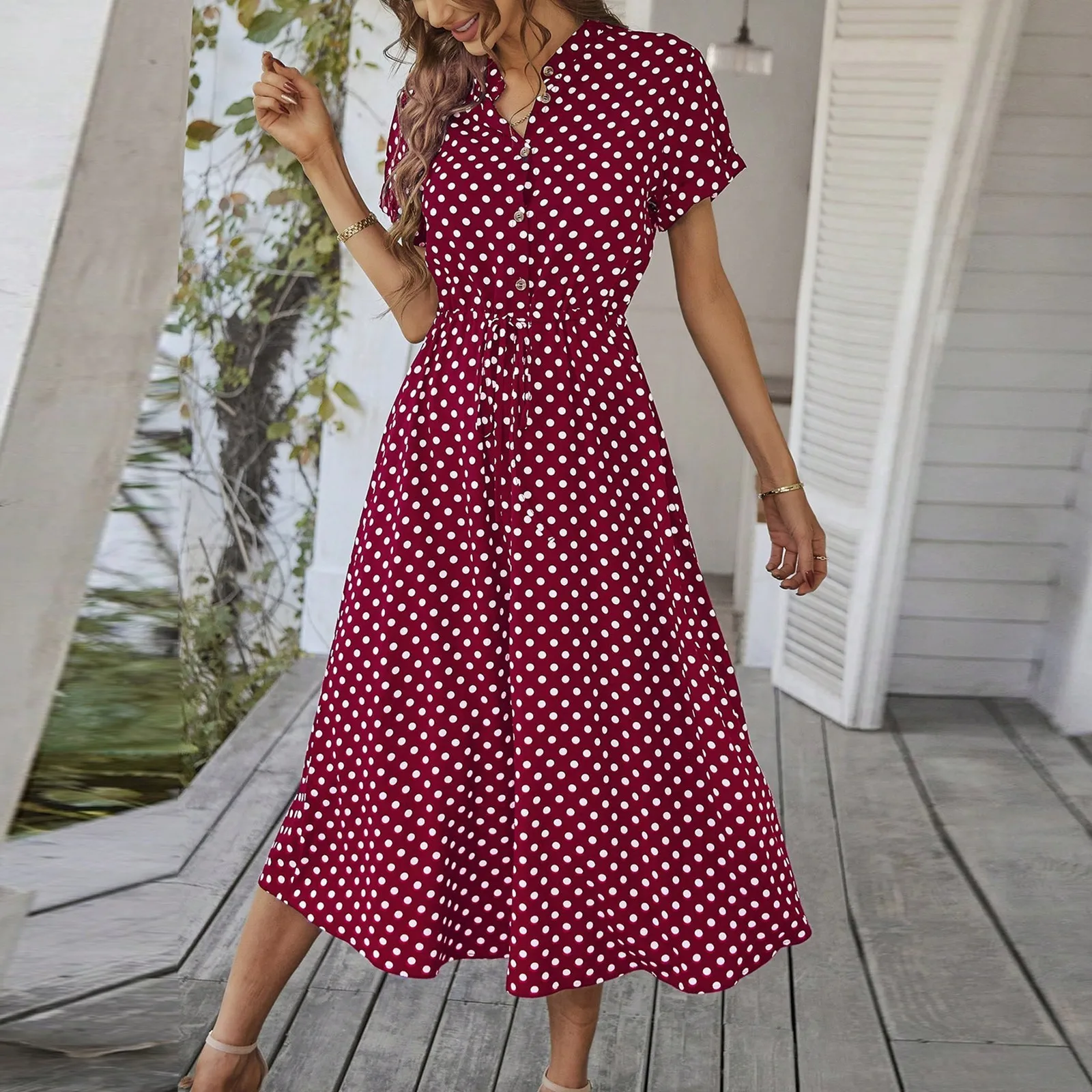 Women's Button Printed Maxi Dress Drawstring Waist V-Neck Elegant