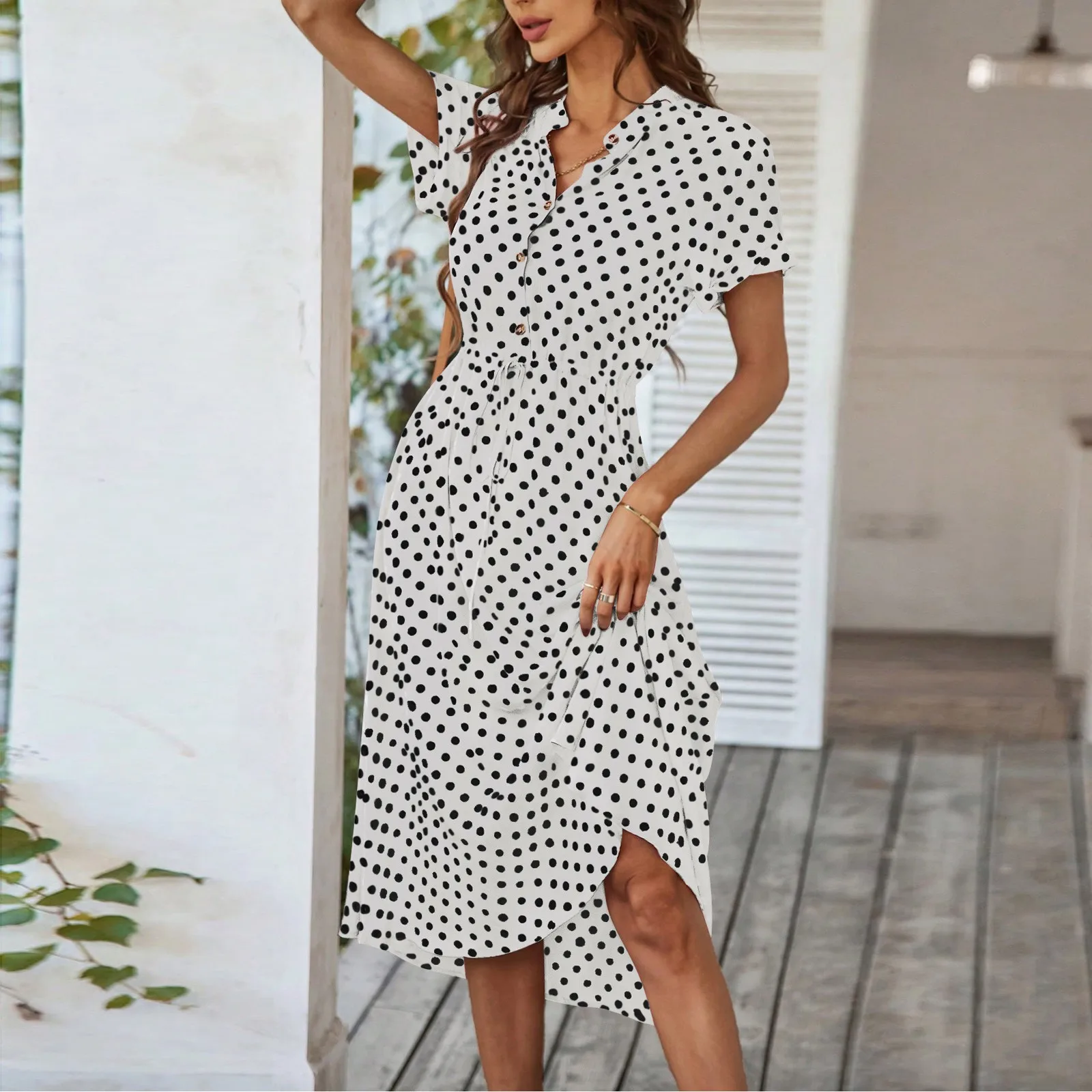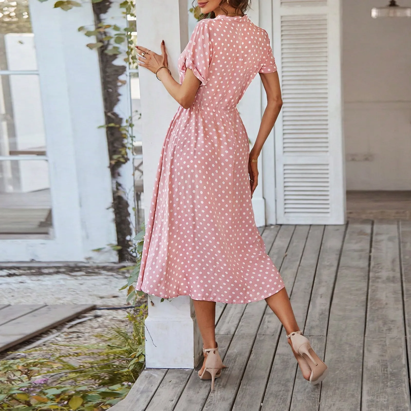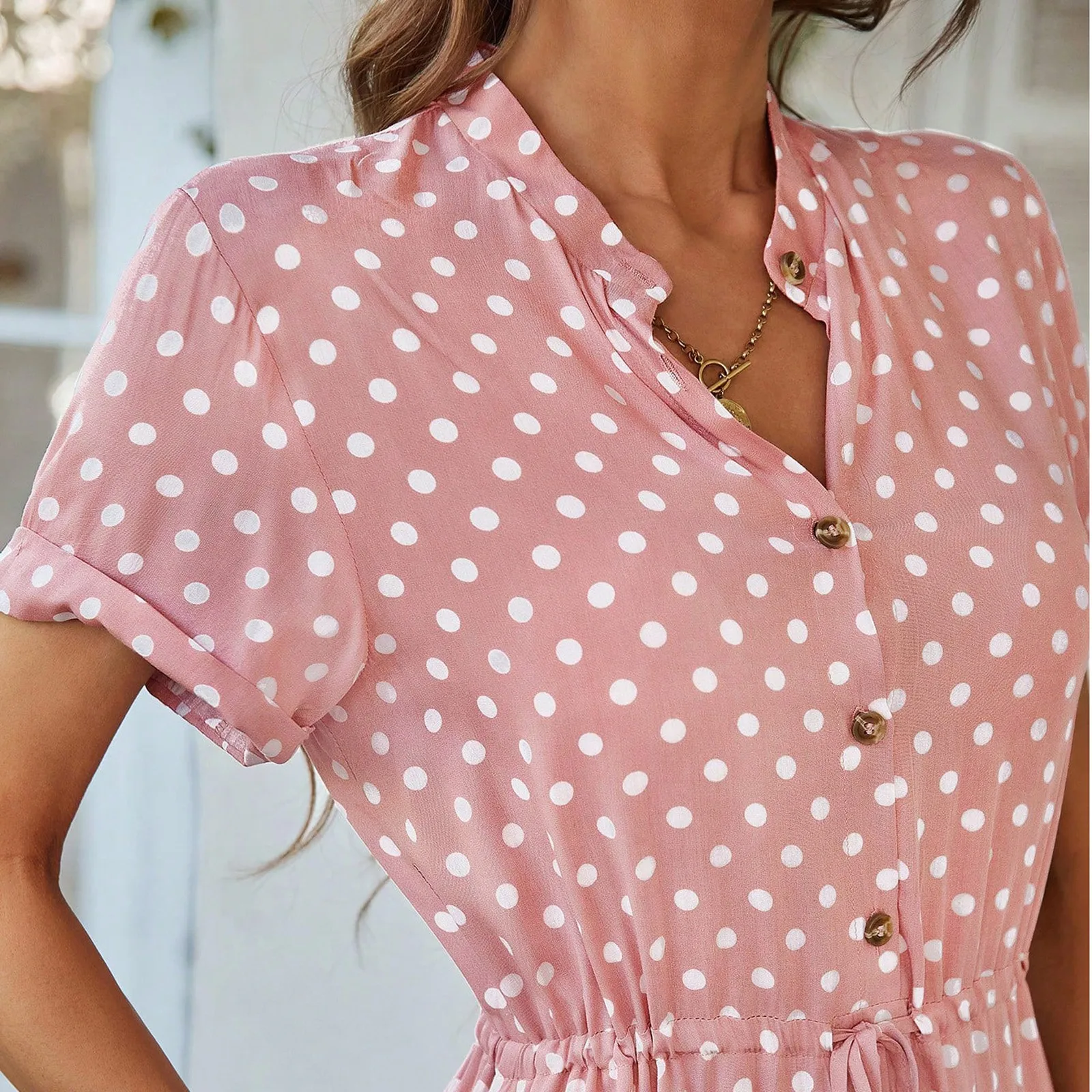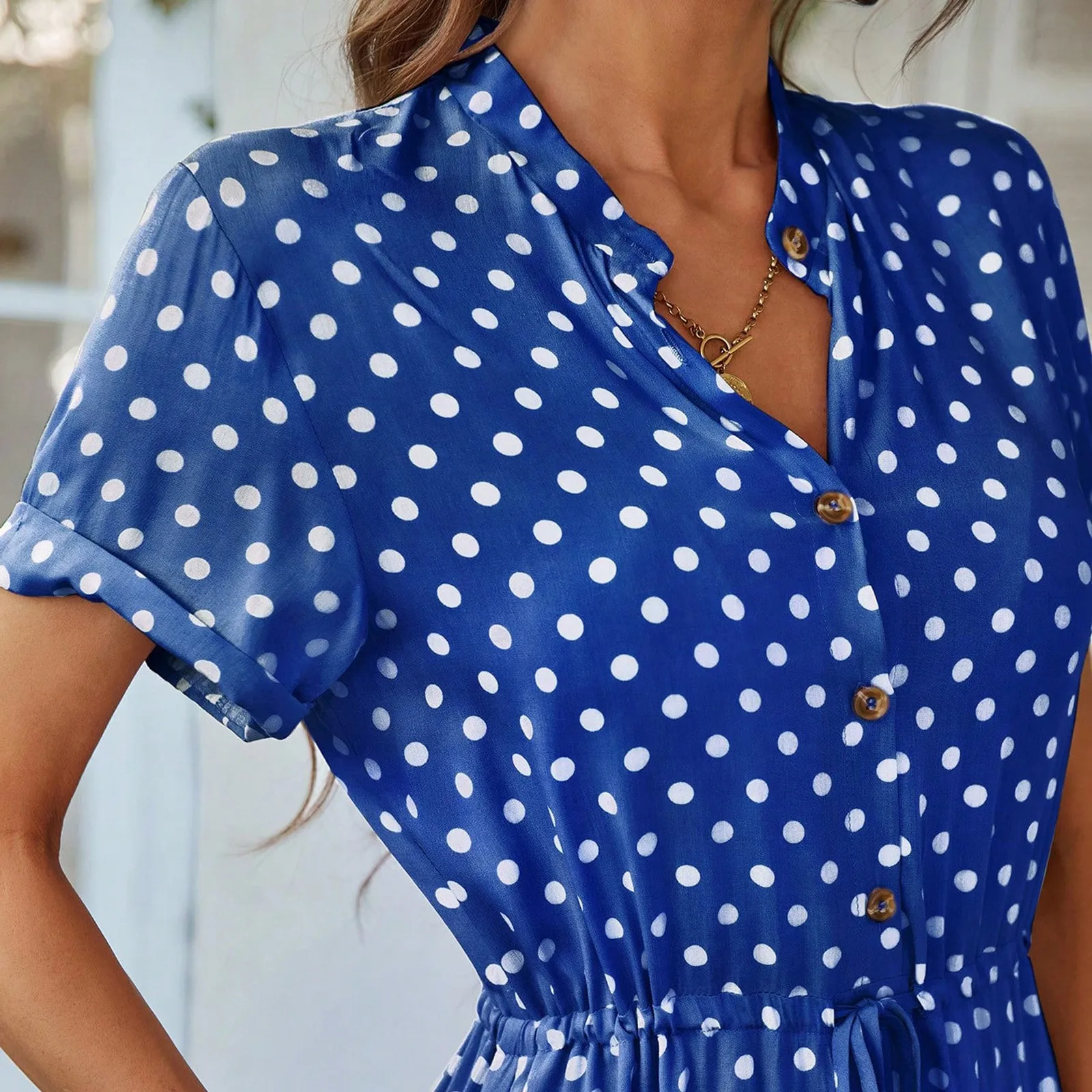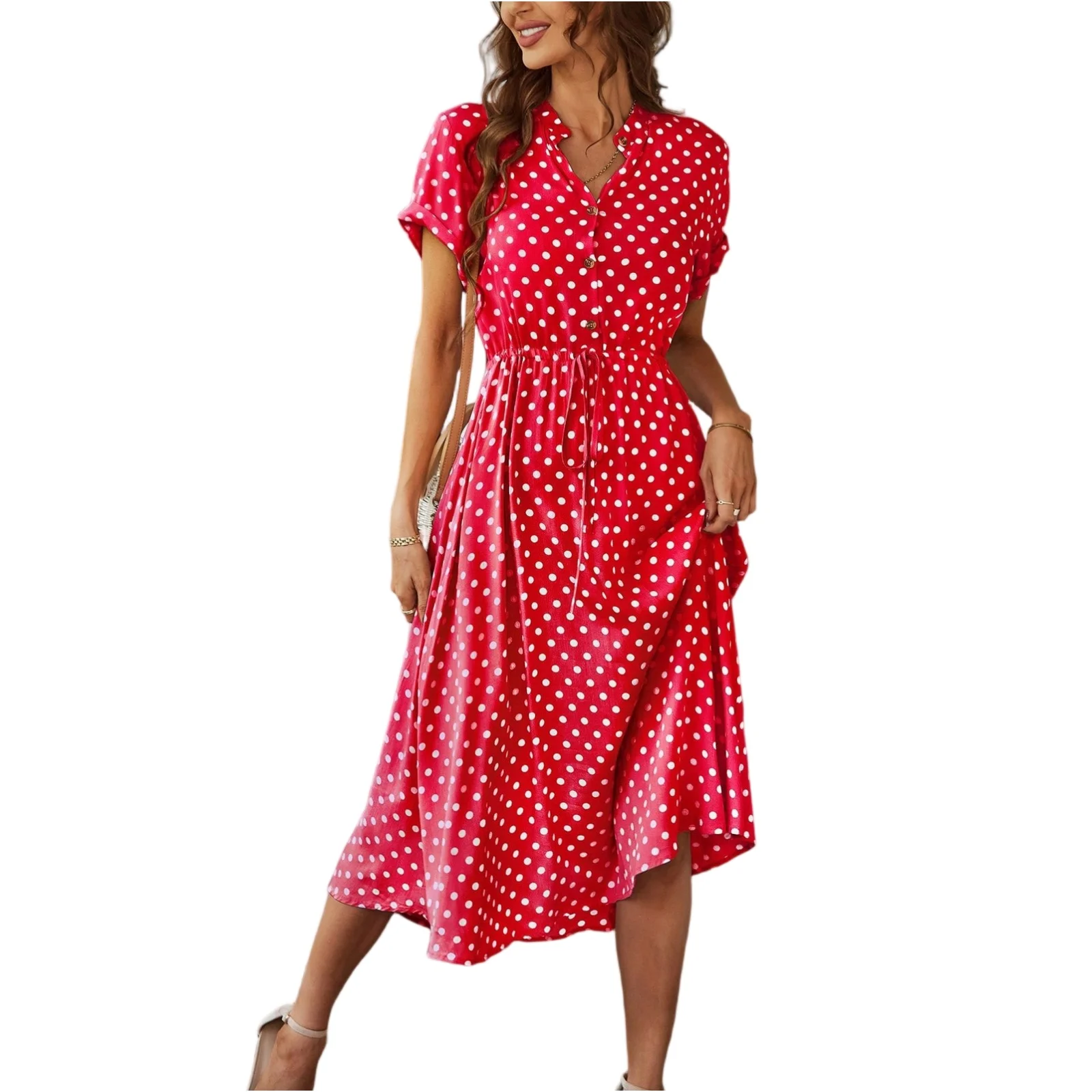 Women's Button Printed Maxi Dress Drawstring Waist V-Neck Elegant