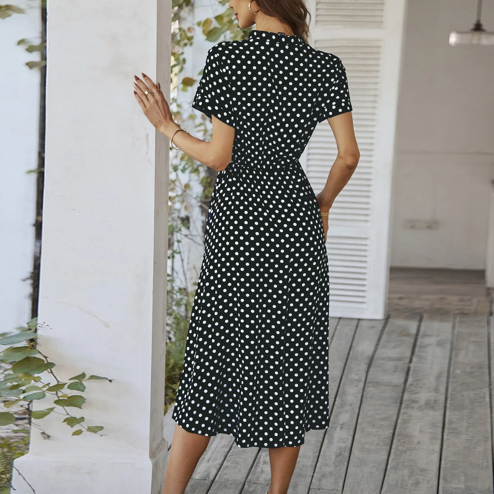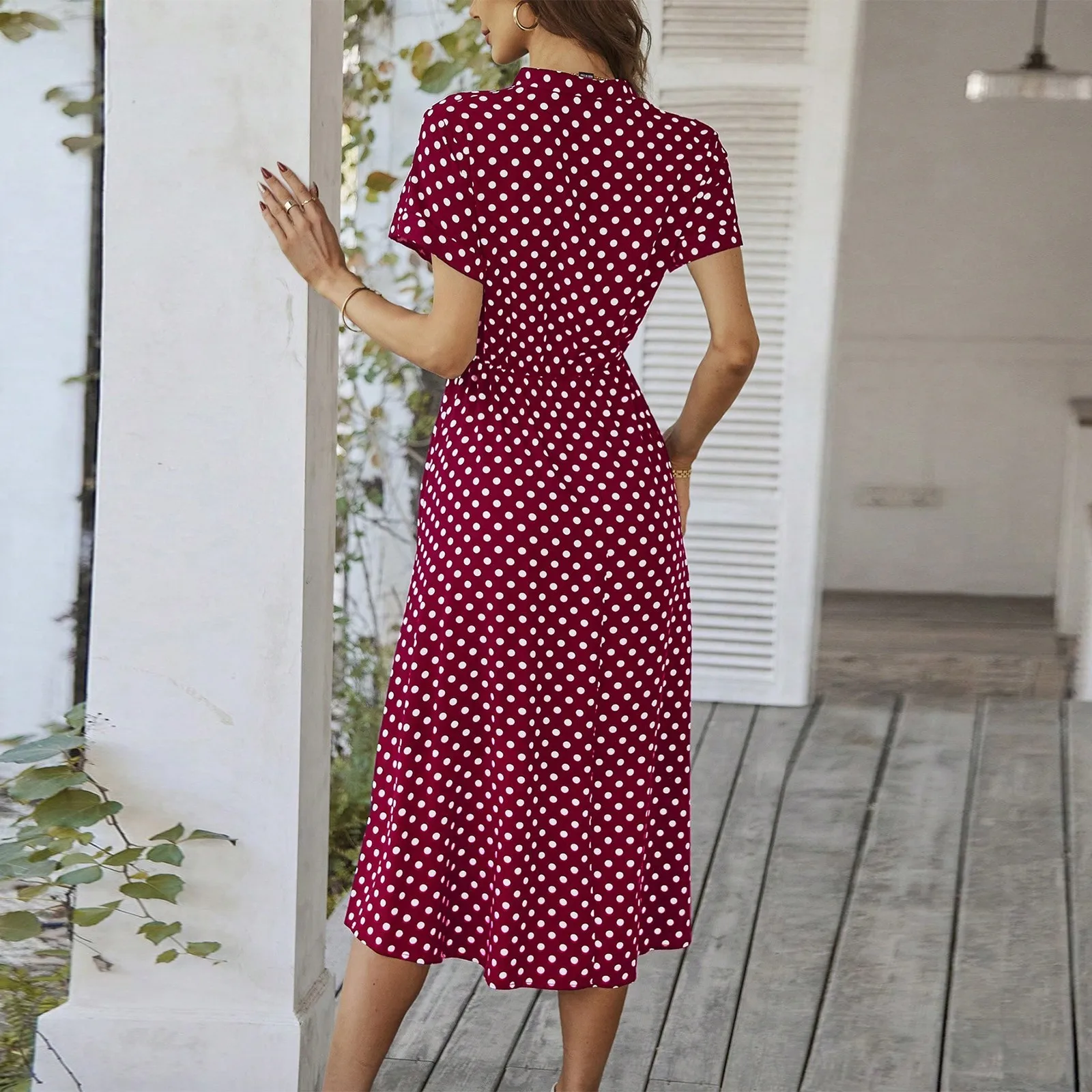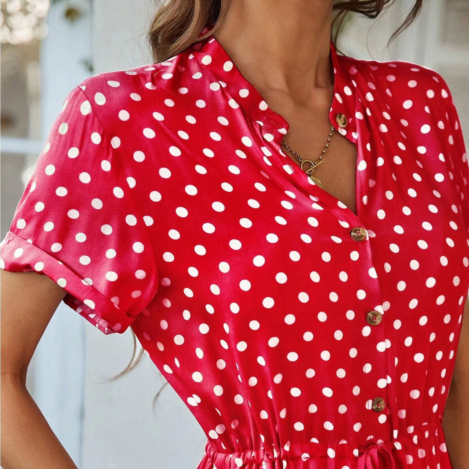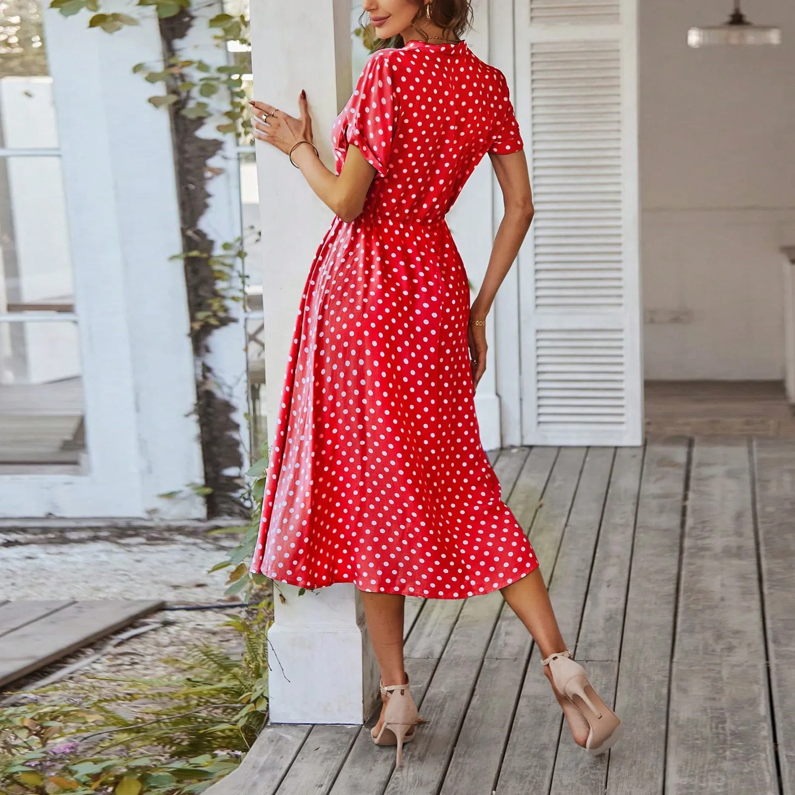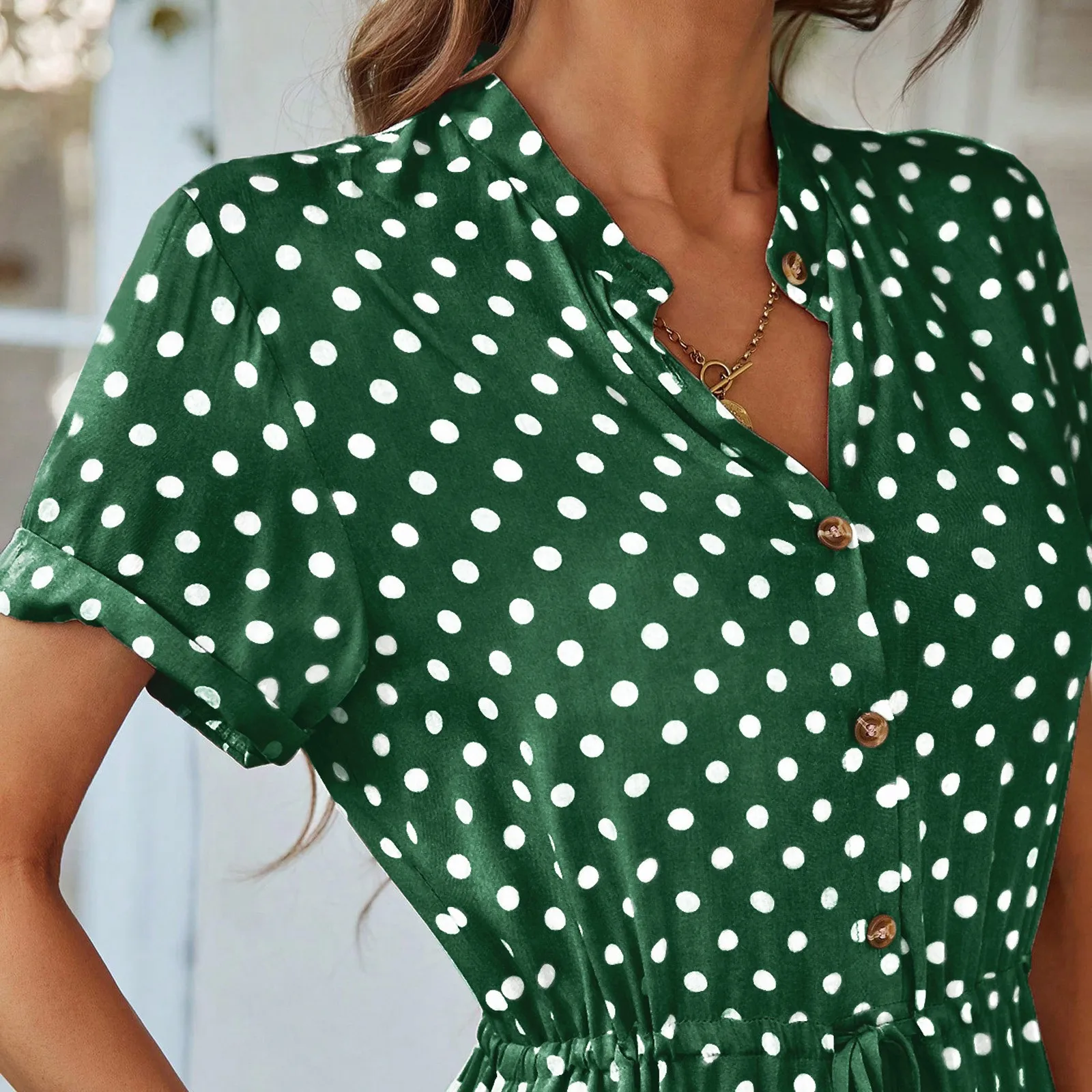 Women's Button Printed Maxi Dress Drawstring Waist V-Neck Elegant