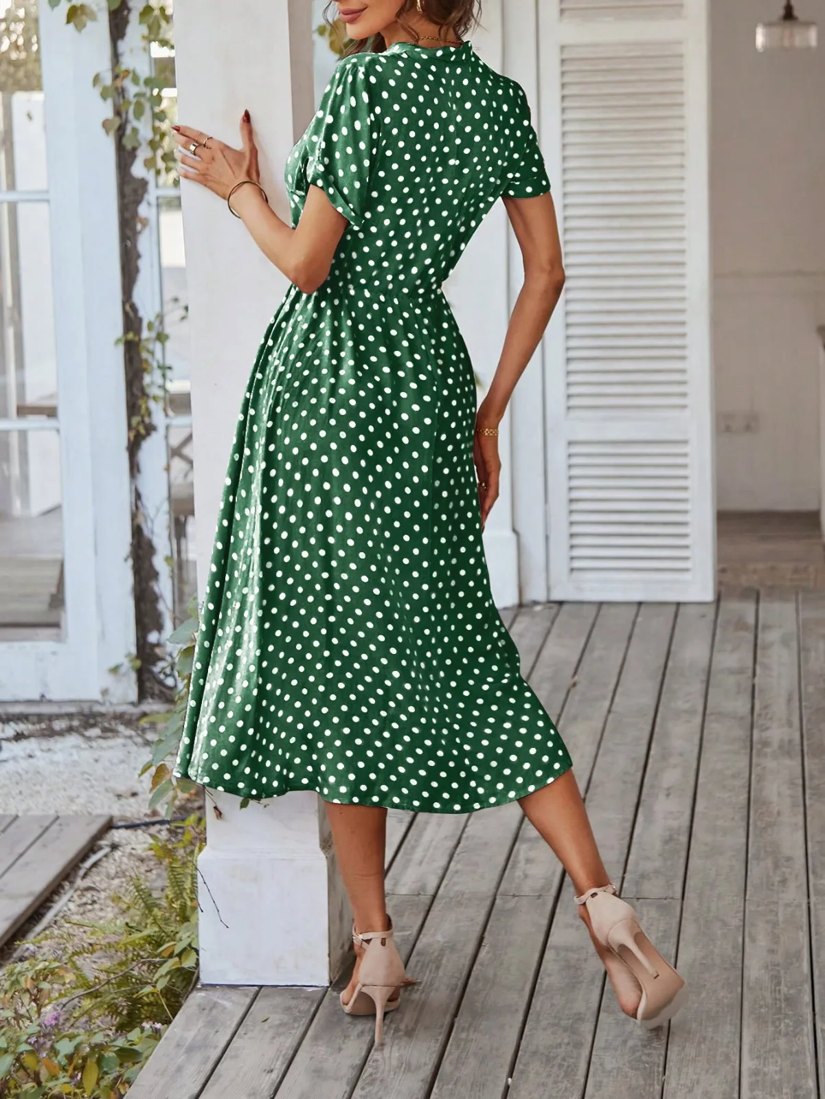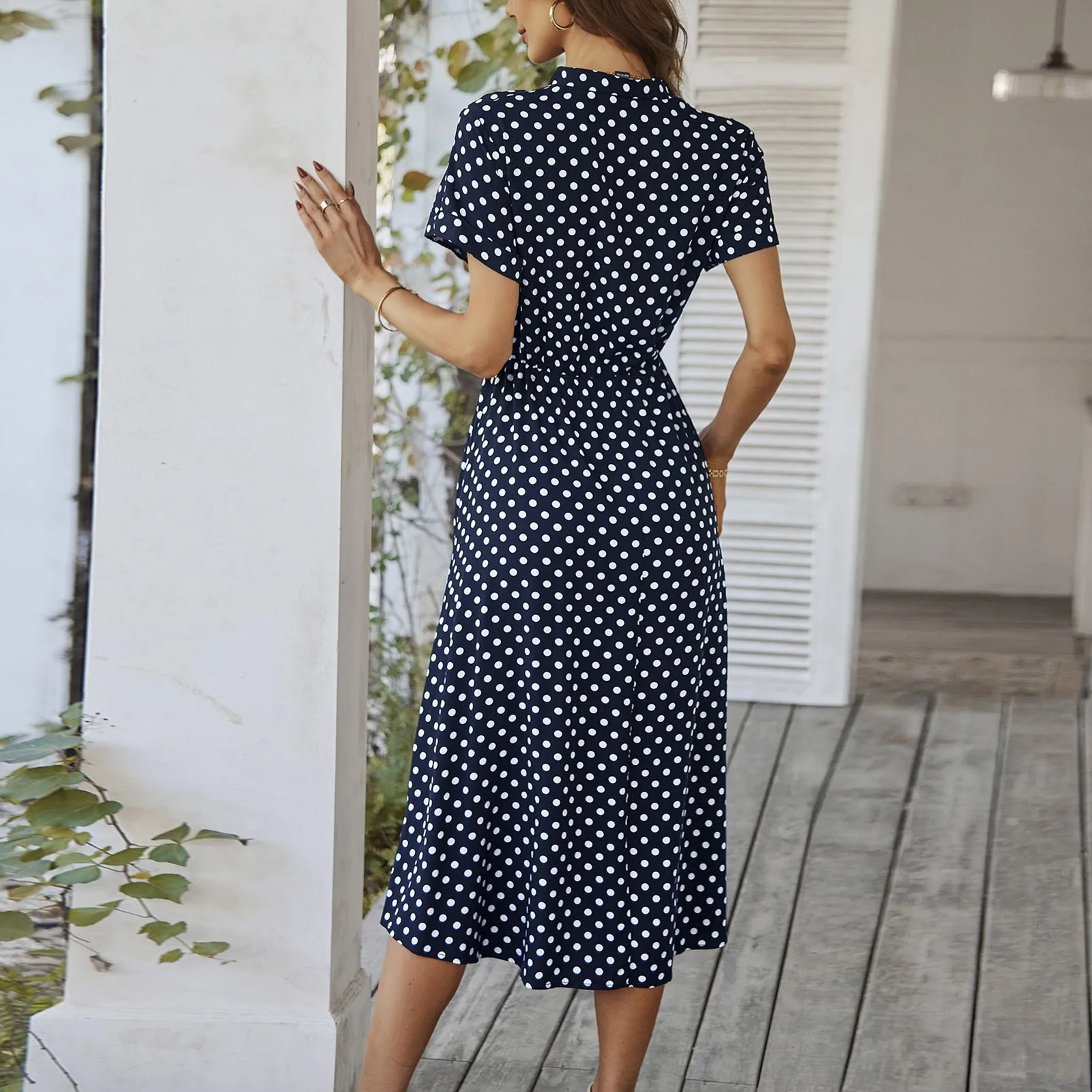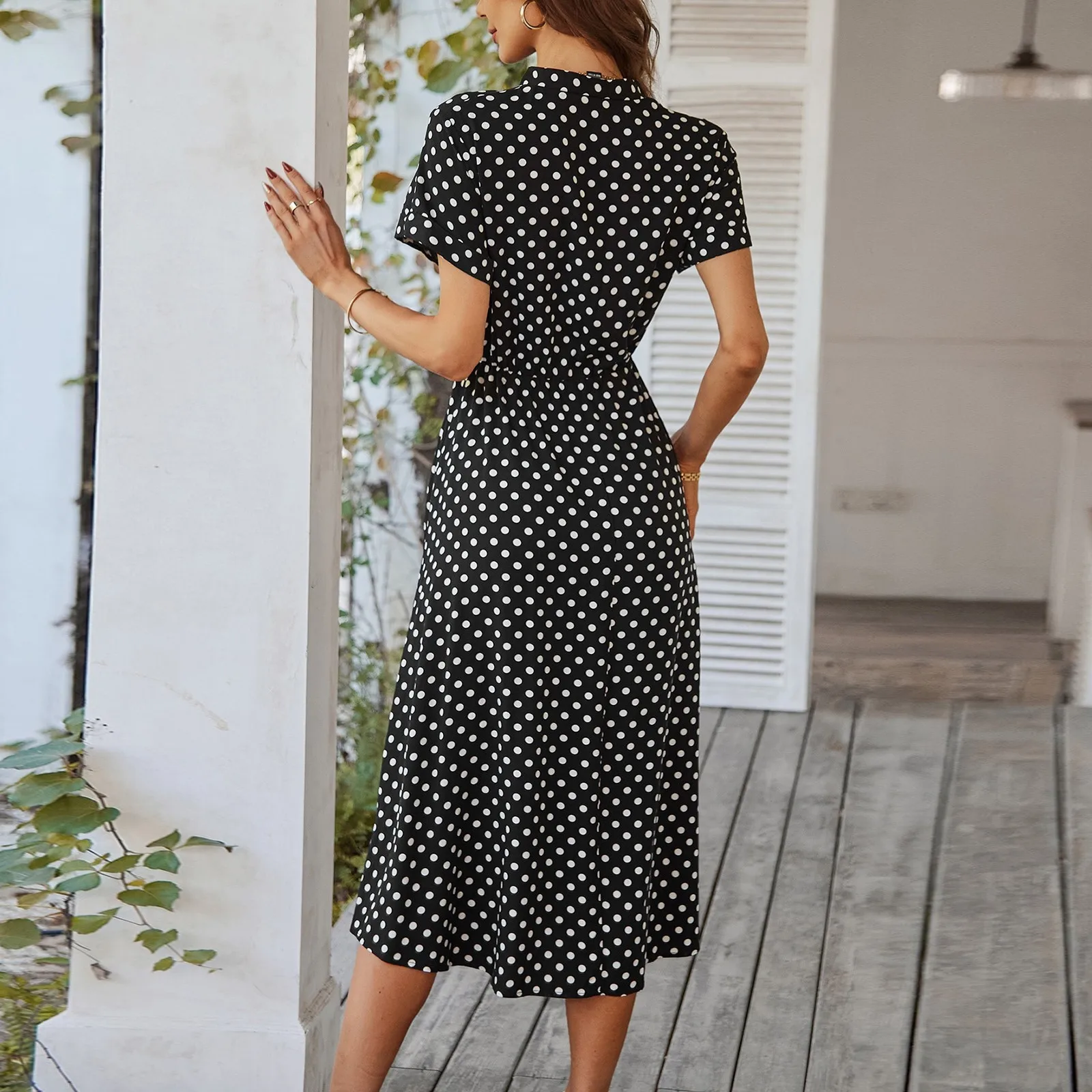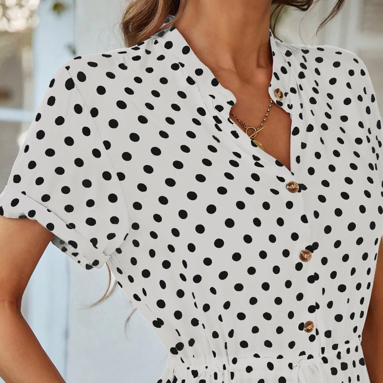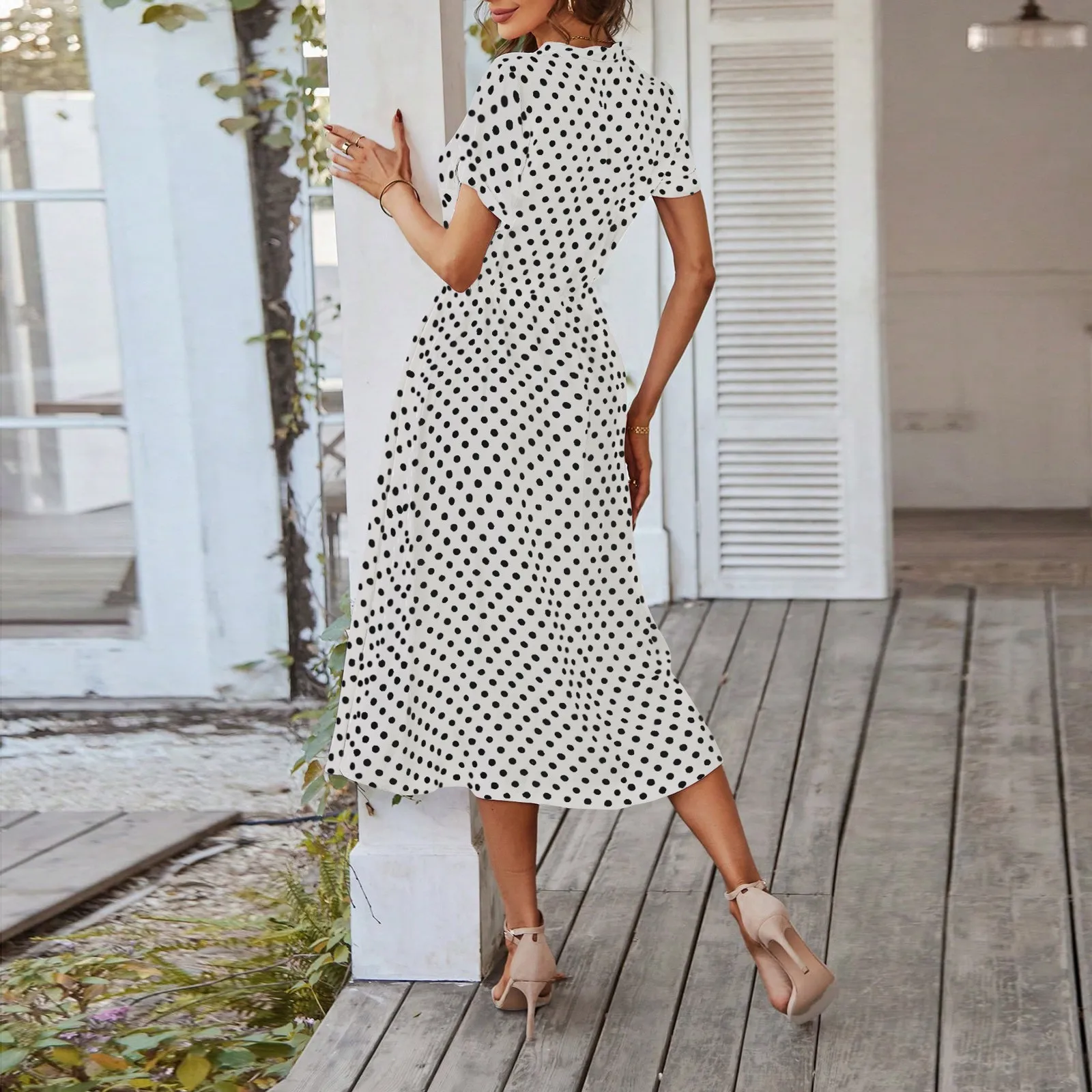 Women's Button Printed Maxi Dress Drawstring Waist V-Neck Elegant