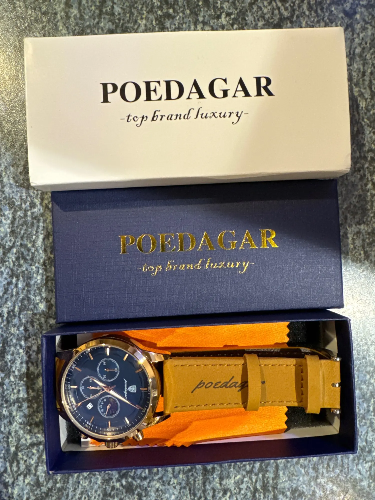Package Included: 1 x POEDAGAR Clock 1 x POEDAGAR Box 1 x Watchband adjust tool(Leather Strap no need) 1 x Watch wipe 1 x Warranty card