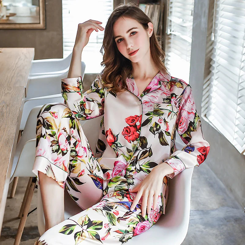 Women Real 100% Mulberry Silk Pajama Sets Floral Printed