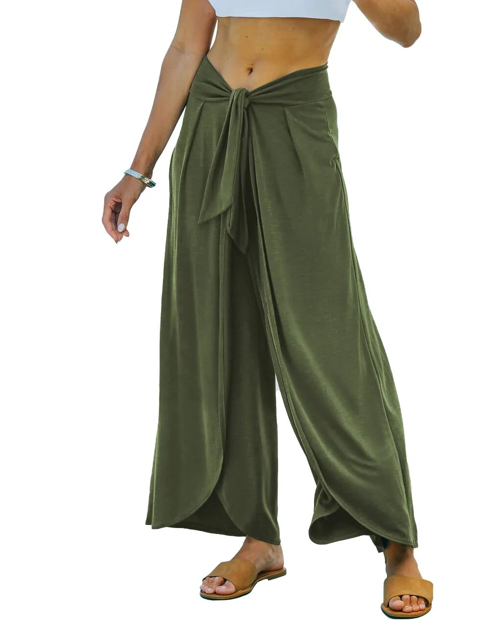 High Waist Flowy Wide Leg Pants Front Split Wrap Elastic