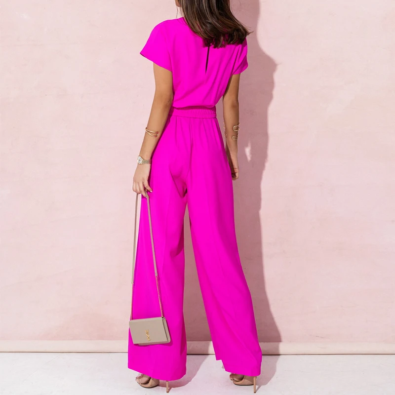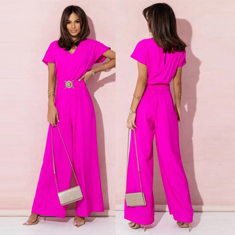 Women's Short Sleeve V-Neck Long Jumpsuit with Belt Solid Color