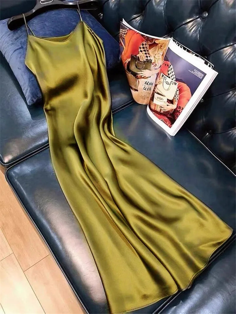 Women Slip Dress Satin Sleeveless V-Neck Solid Silk Elegant Vintage