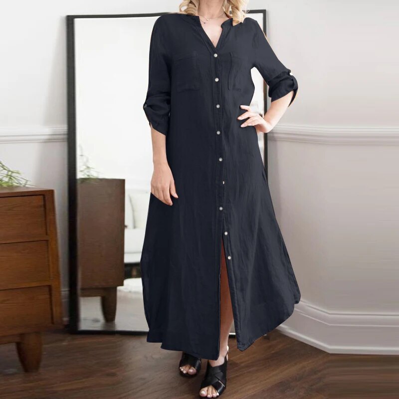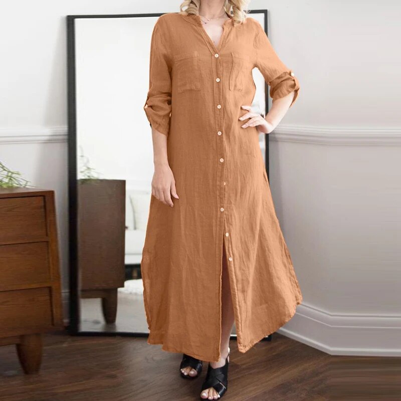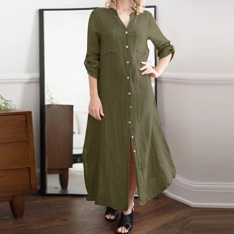 Woman Dress Solid Long Sleeve V-Neck Shirtdress
