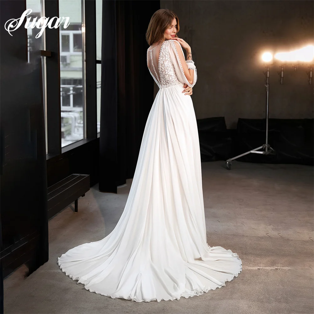A Line Wedding Dress V Neck Lace Appliques Customized Chiffon