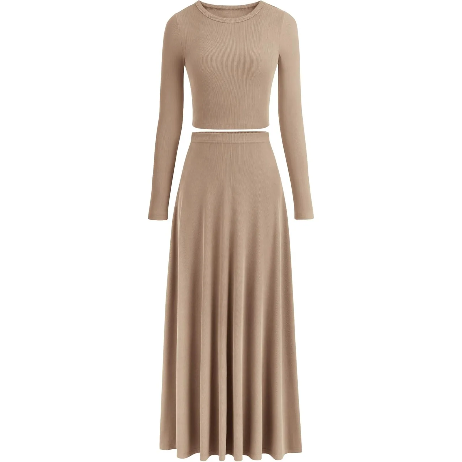 Set Of Long Sleeve Short Top And High Waist Pleated Skirt