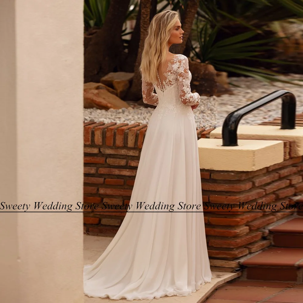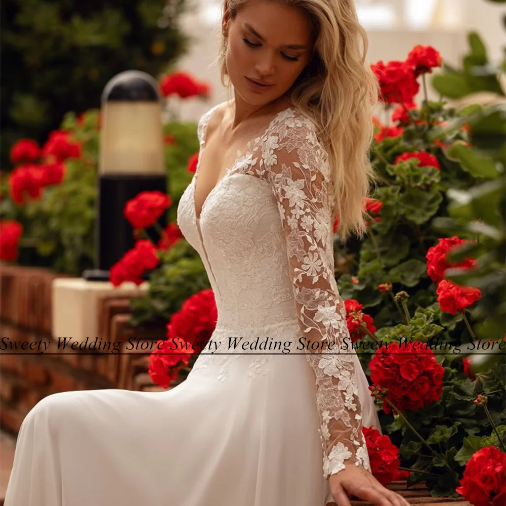 Cheap Boho Wedding Dress Bride Long Sleeves V Neck Chiffon