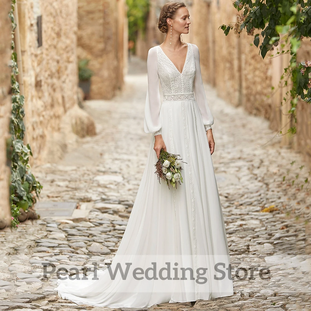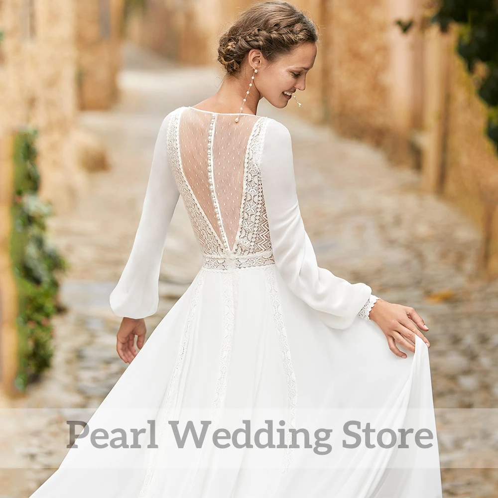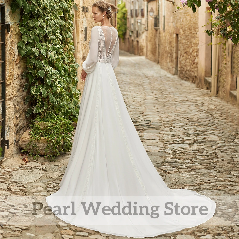 Boho Wedding Dress Chiffon Lace A-Line with Button Sweep Train