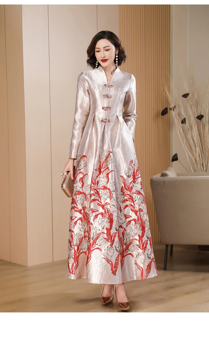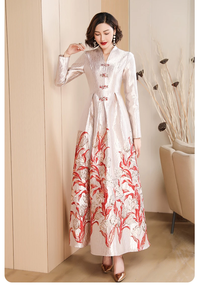 Luxury Long Sleeve Jacquard Dress Floral Long Evening Events Dress